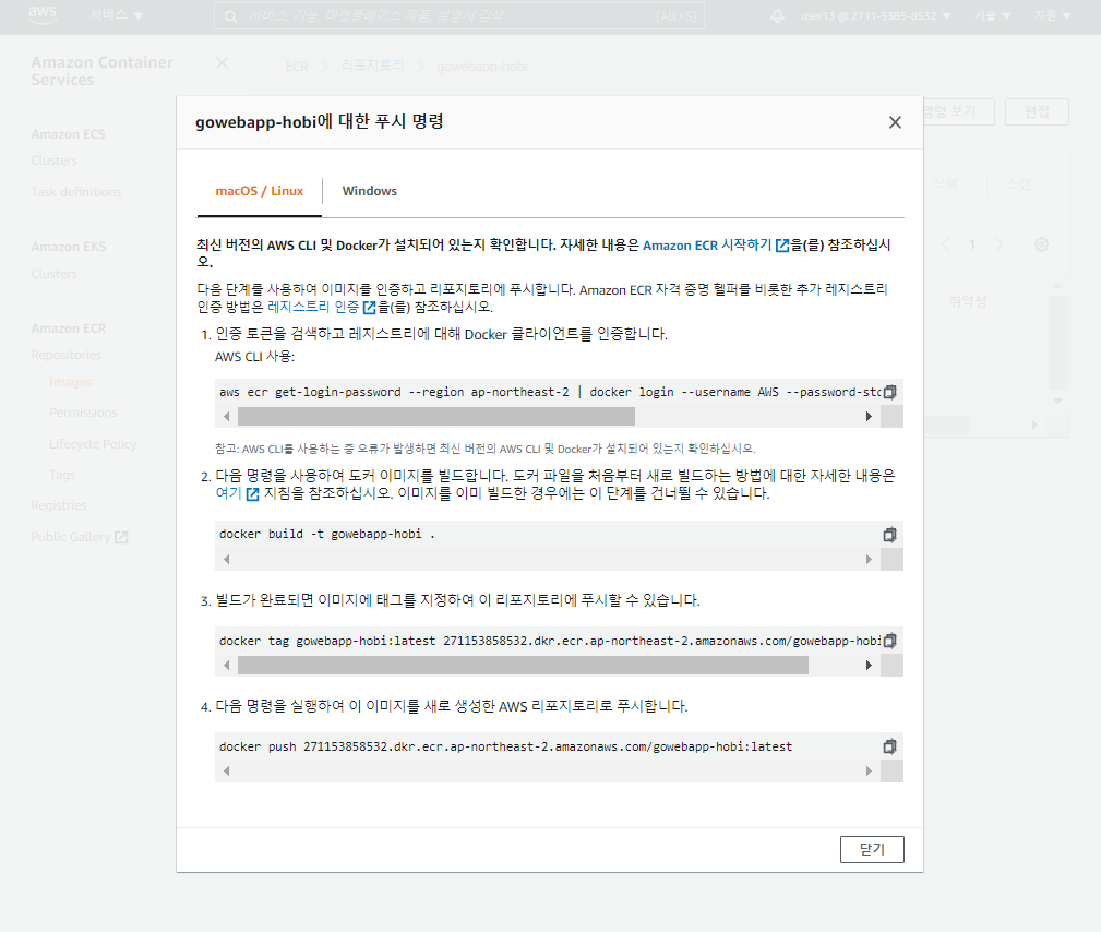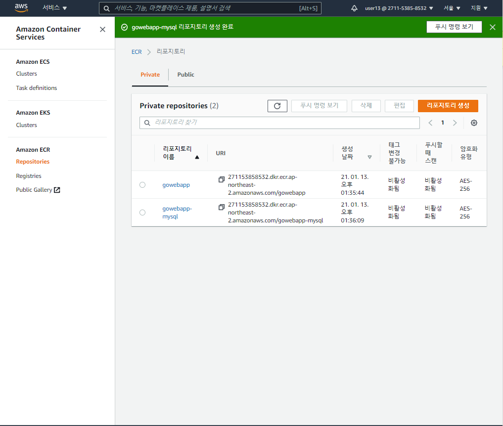 내 레지스트리 이름 '271153858532.dkr.ecr.ap-northeast-2.amazonaws.com'