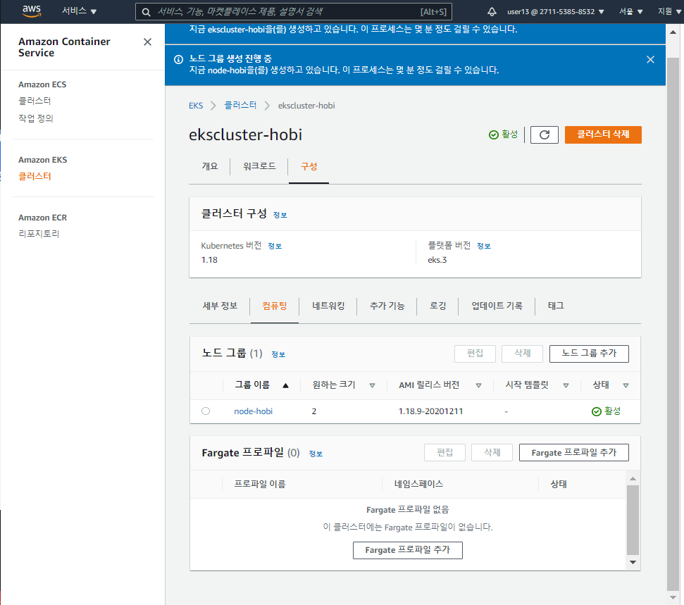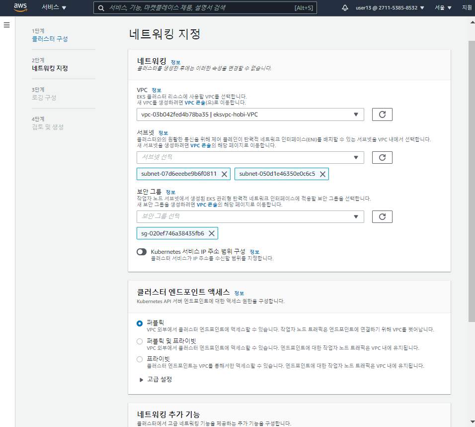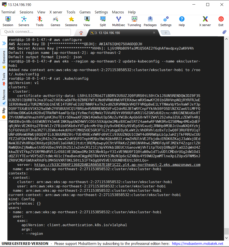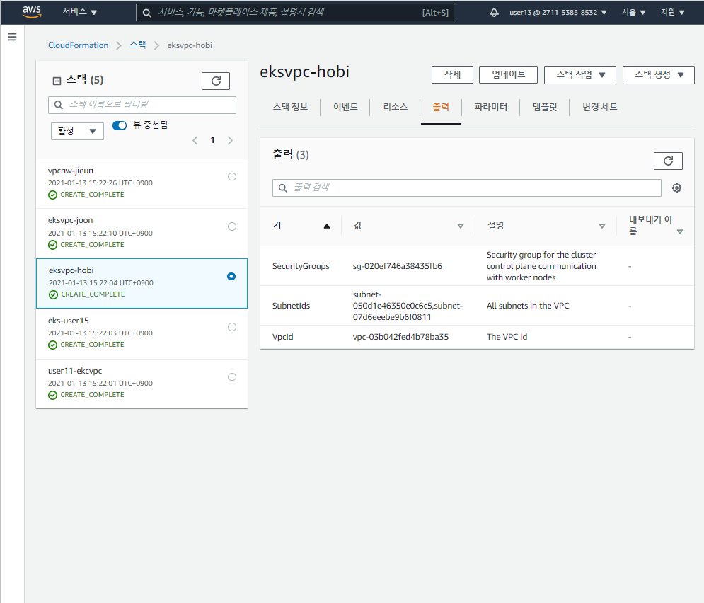 - AWS CLI 사용자 등록을 위한 자격증명(엑세스키 ID와 비밀 엑세스키) 입력